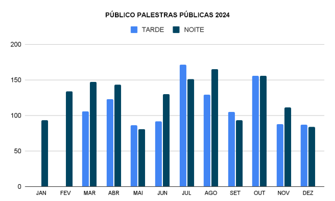 Durante o ano, foram realizadas 85 exposições, com a presença total de 2.631 pessoas e média de 30,95 presentes por evento.