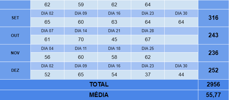 Foram realizados 53 encontros, com um total de 2.956 participantes e uma média de 55,77.