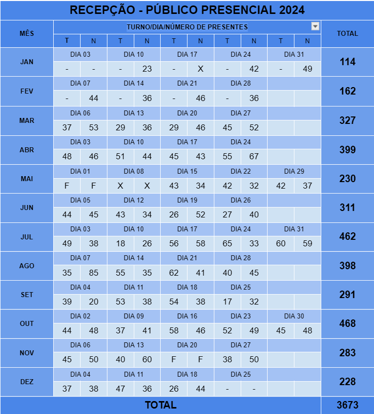 Com o objetivo de qualificar o trabalho, foi realizado um encontro virtual com o tema “Recepção na Casa Espírita - A importância do acolhimento fraterno", no mês de setembro. Durante o ano de 2024 foram registradas 3.673 presenças.