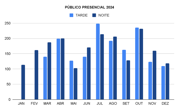 Foram realizados dois encontros para avaliação e planejamento da atividade, em abril e dezembro. No ano de 2024 foram realizados 52 encontros, com um total de 405 e média de 7,78 participantes.