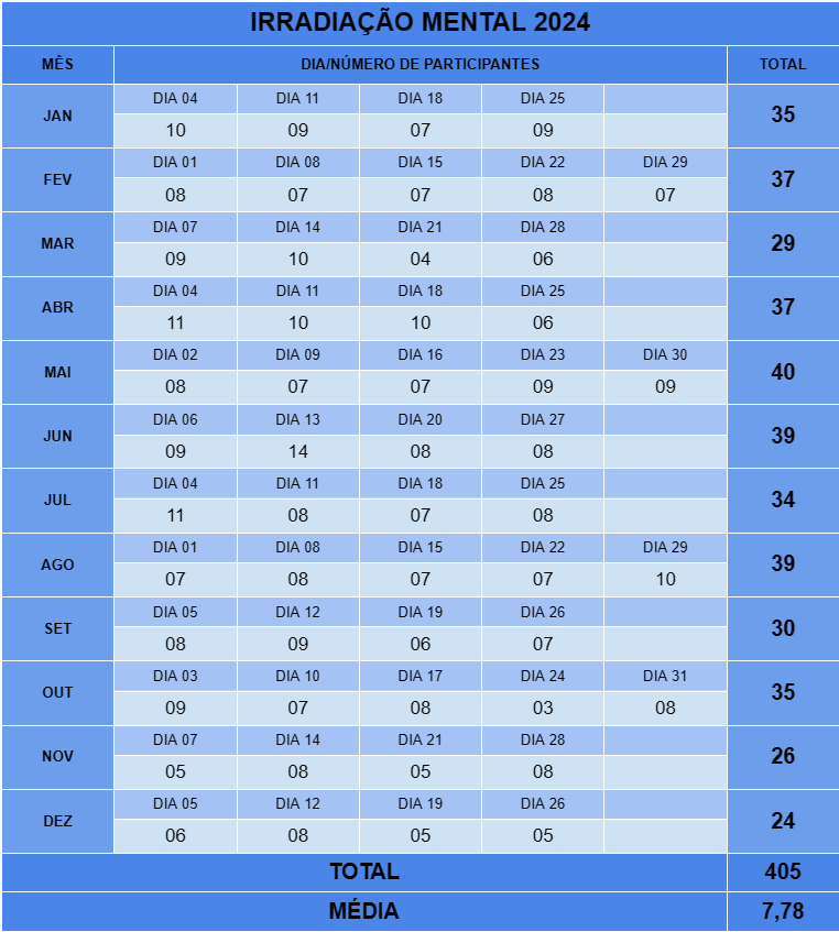 Em 2024, contamos com 4 grupos mediúnicos, pois o grupo de prática da mediunidade, iniciado em 2023, foi oficialmente integrado como um grupo mediúnico. A composição dos grupos ficou assim: