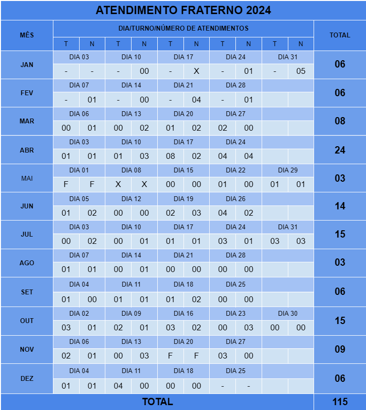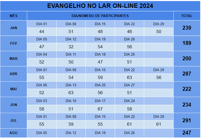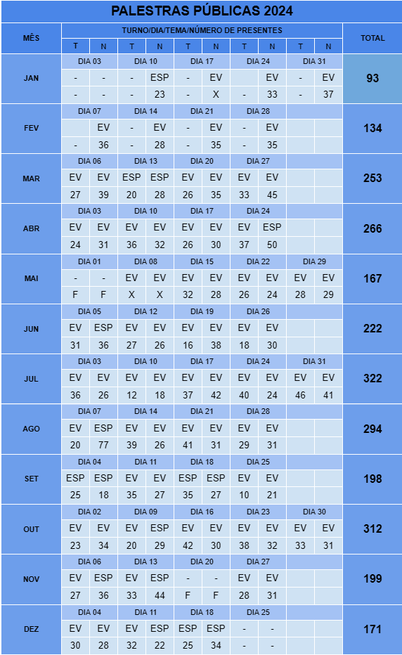 Com o objetivo de qualificar o trabalho, foi realizado um encontro virtual com o tema “Recepção na Casa Espírita - A importância do acolhimento fraterno", no mês de setembro. Durante o ano de 2024 foram registradas 3.673 presenças.