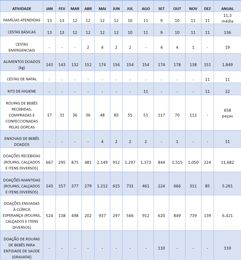 Ao longo do ano de 2024, a equipe conduziu encontros semanais às quartas-feiras para organizar as doações de roupas e alimentos recebidos na Casa Espírita. Nessas ocasiões, foram também prestados atendimentos a pessoas necessitadas que buscavam por alimentos ou assistência.