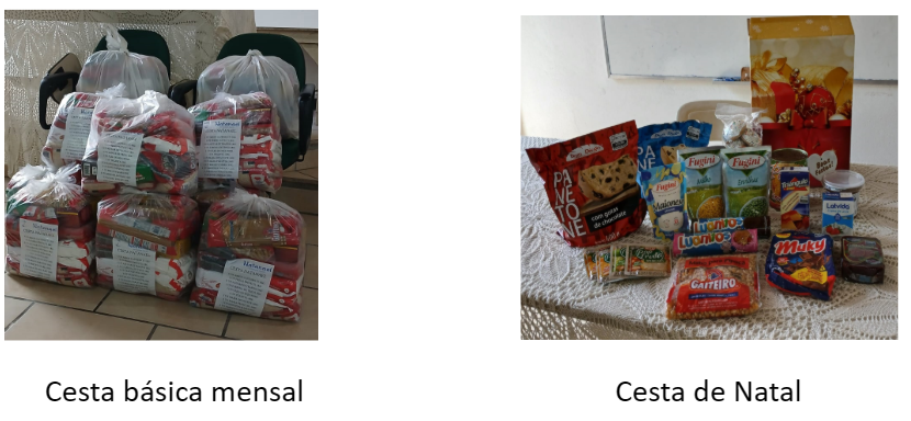 As cestas básicas foram entregues aos acolhidos no último sábado de cada mês, exceto em dezembro, quando a entrega ocorreu no sábado anterior ao Natal.